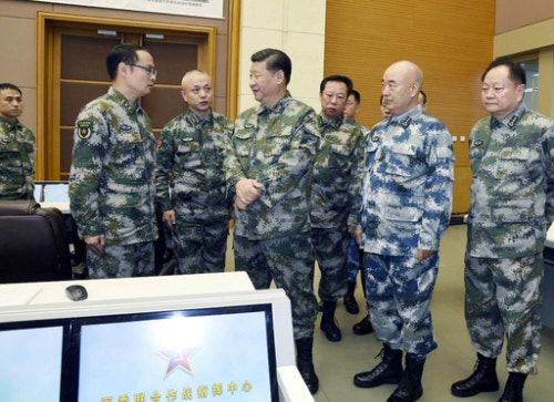 | 군복 입은 시진핑ong> 군복 차림의 시진핑 중국 국가주석(왼쪽 세번째)이 지난 3일 베이징의 공산당 중앙군사위원회 연합작전지휘센터를 시찰하고 있다. 그는 이 자리에서 강군 건설을 거듭 강조했다. 시 주석은 지난 7월 건군 90주년 기념 열병식에도 군복을 입고 등장했다. 베이징= AP 신화연합뉴스 |