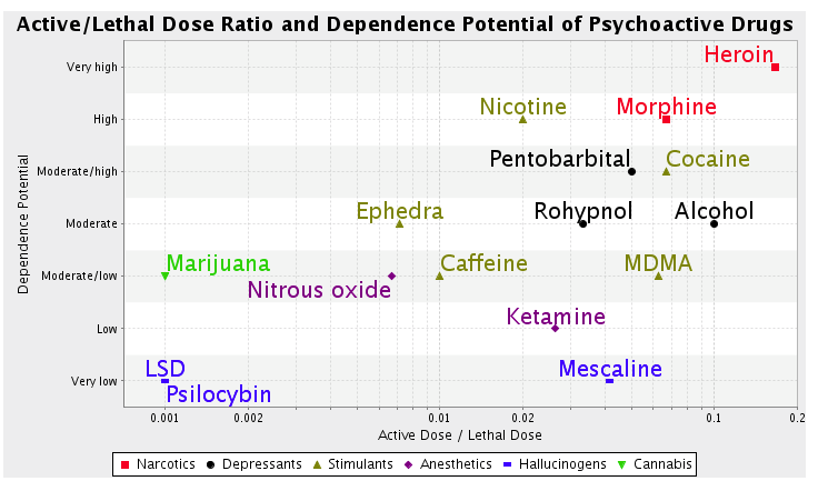 x축은 복용량을 치사량으로 나눈 것인데 헤로인이 그중 TOP